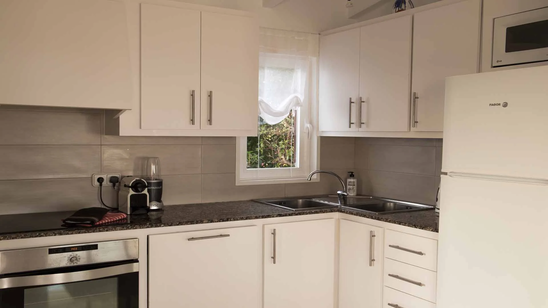 The living space is open plan. There is a dining table inside but to be honest we rarely use it, preferring to eat breakfast, lunch and supper "al fresco" on the covered terrace enjoying the view. The kitchen is equipped with most of the things you might need including a Nespresso coffee machine and a Nutribullet and there is a charcoal BBQ on the terrace by the pool.